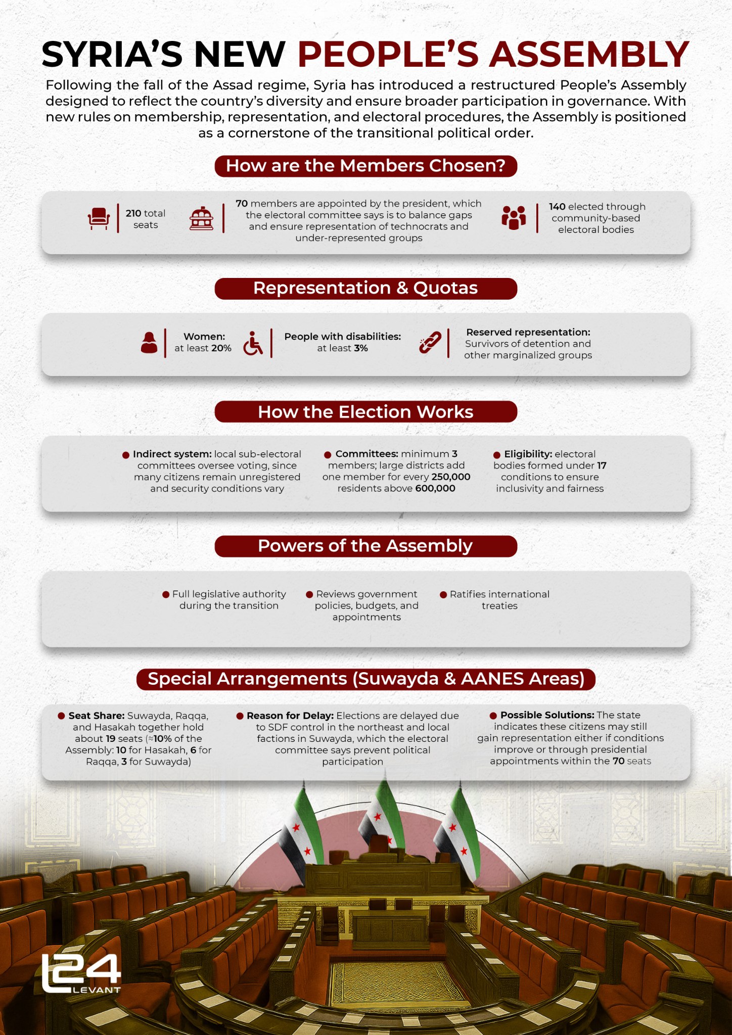Infographics Syria’s New People’s Assembly October 2, 2025 FacebookTwitterPinterestWhatsApp With elections scheduled next week, Syria has introduced a restructured People’s Assembly to ensure broader participation in governance.