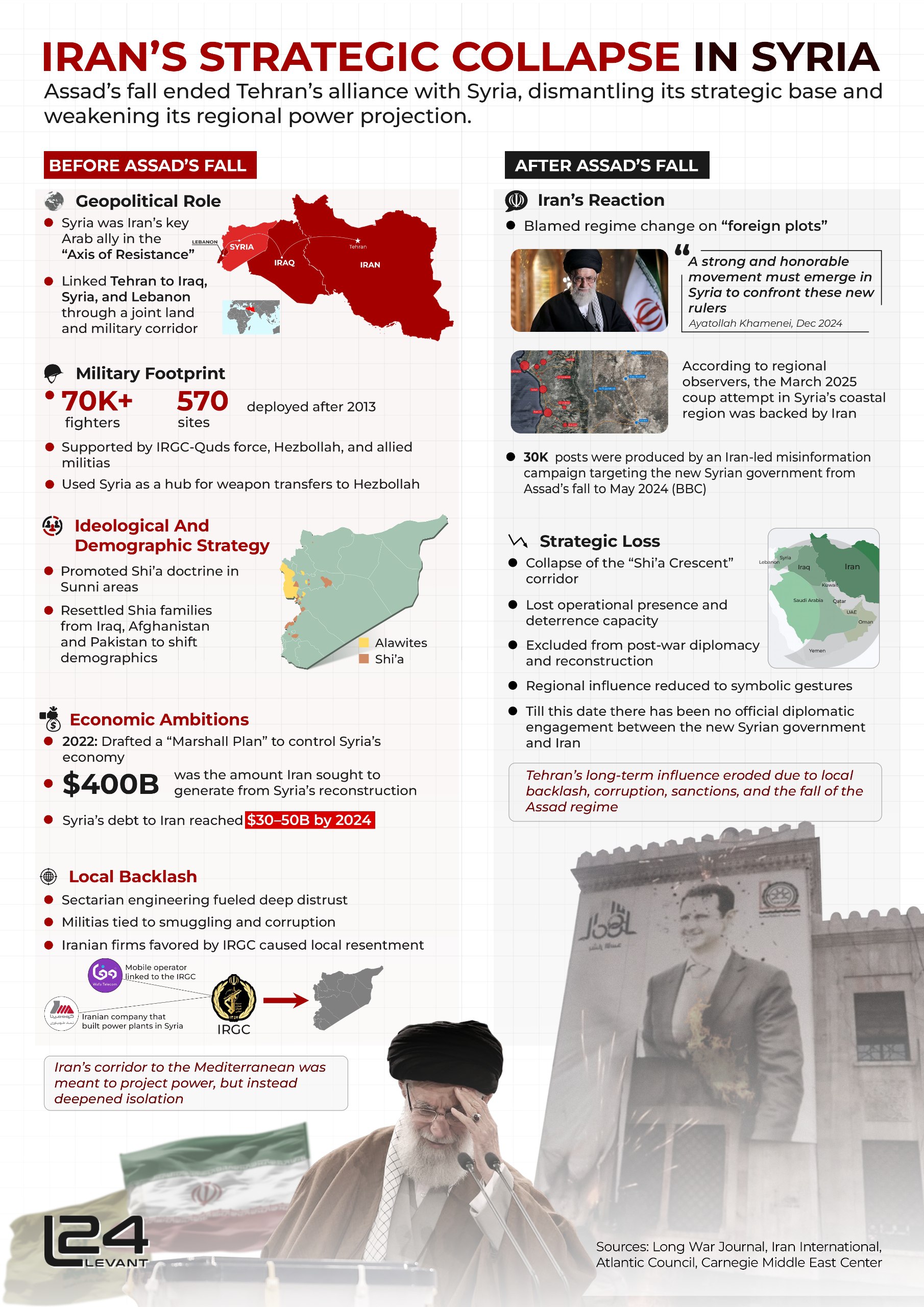 Infographics Iran’s Strategic Collapse in Syria November 27, 2025 FacebookTwitterPinterestWhatsApp On this day a year ago, revolutionary forces made final preparations to launch an offensive that would not only topple Assad’s regime but remove Iran from Syria and loosen its iron grip on the region.