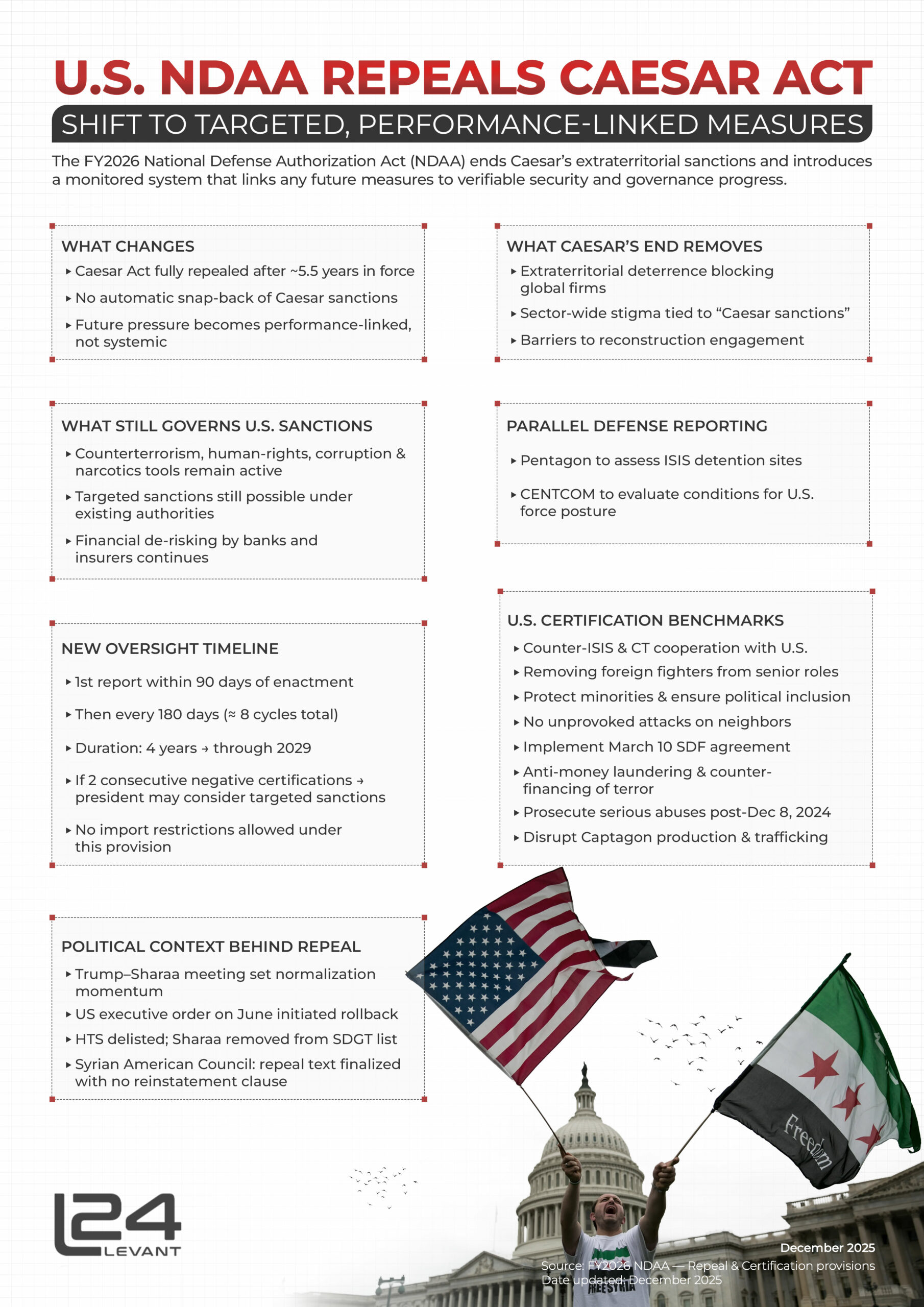 Infographics U.S. NDAA Repeals Caesar Act December 8, 2025 FacebookTwitterPinterestWhatsApp The FY2026 National Defense Authorization Act (NDAA) ends Caesar’s extraterritorial sanctions and introduces a monitored system that links any future measures to verifiable security and governance progress.
