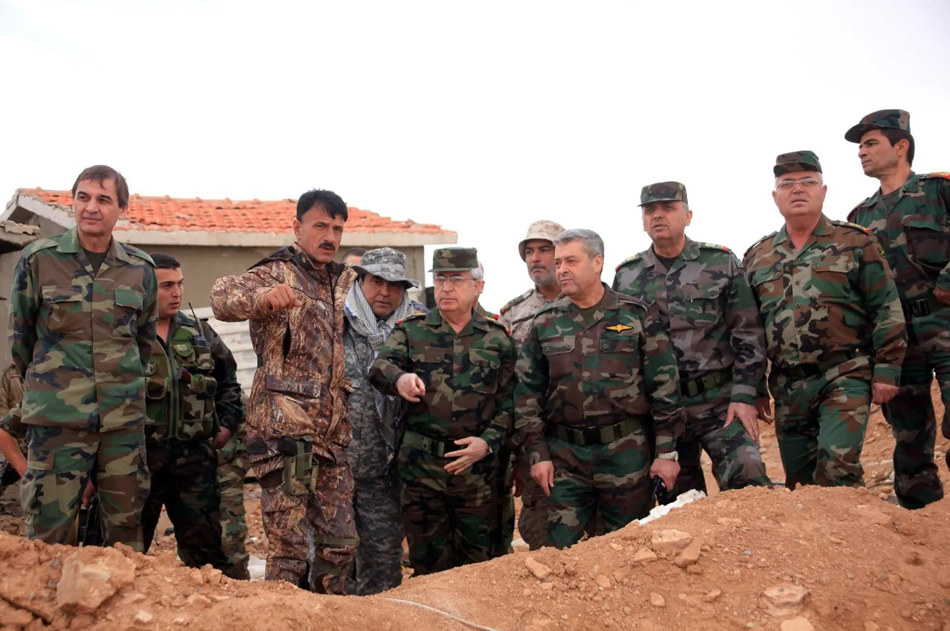 Hussam Louka, far left, Assad regime official implicated in overseeing mass detention and systemic torture. Pictured with Suhail al-Hassan and Ali Ayyoub, third and fifth from left. (SANA)