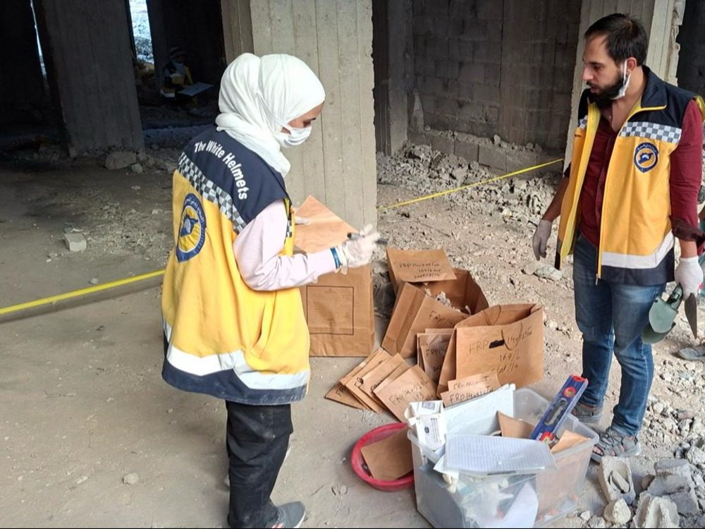 Members of the Syrian Civil Defense secure the site of a mass grave in Damascus’ Tadamon neighborhood. (White Helmets/Social Media)