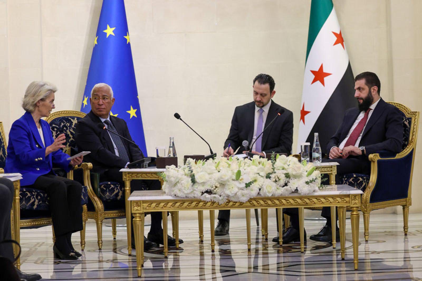 In a clear signal of renewed European engagement, President Ahmad al-Sharaa received European Commission President Ursula von der Leyen and European Council President António Costa, along with their accompanying delegation, at the People’s Palace in Damascus.