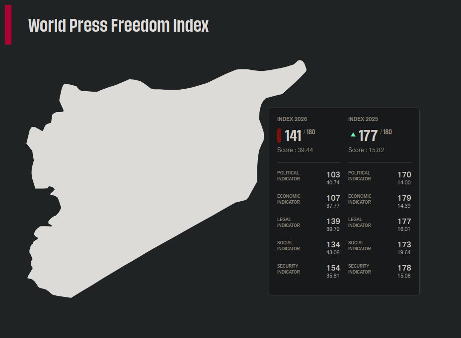 Syria recorded the greatest improvement in media freedom, climbing to 141st place out of 180 countries in the 2026 World Press Freedom Index published by Reporters Without Borders (RSF). The ranking marks a jump from 177th in 2025 and 179th in 2024, when the country stood near the bottom globally.